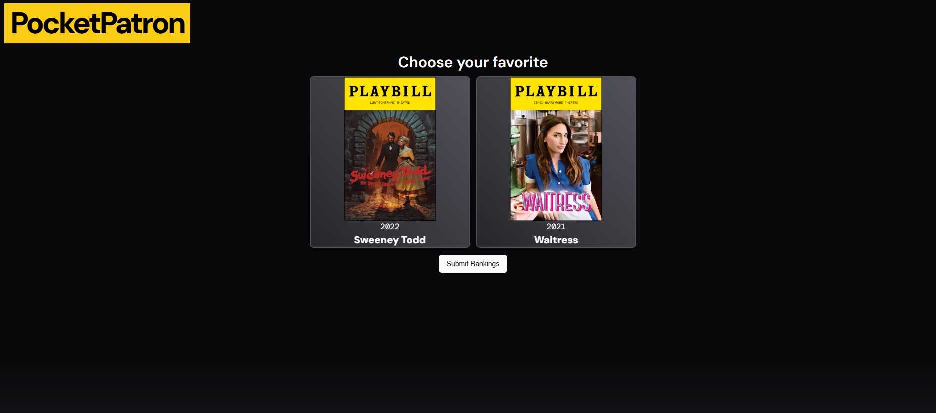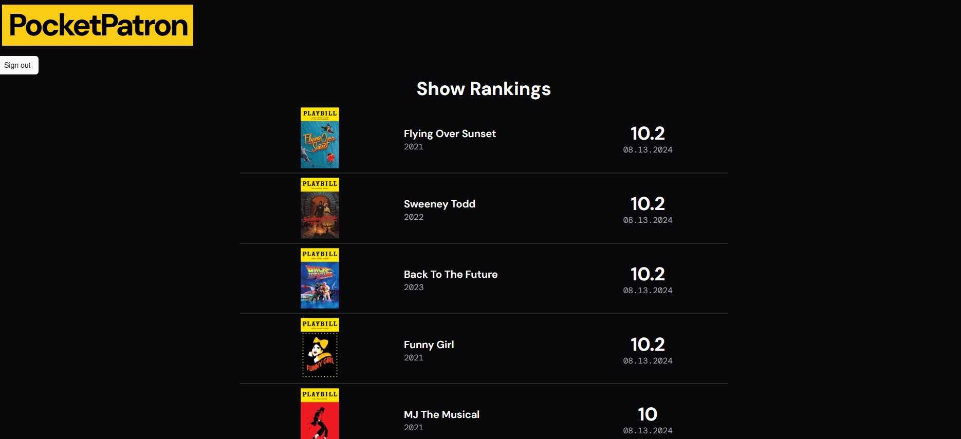 This new web app, PocketPatron, allows users to document the shows they see and rank them algorithmically. No more racking your brain everytime someone asks which shows you have seen. Pull out your phone and show them PocketPatron!
